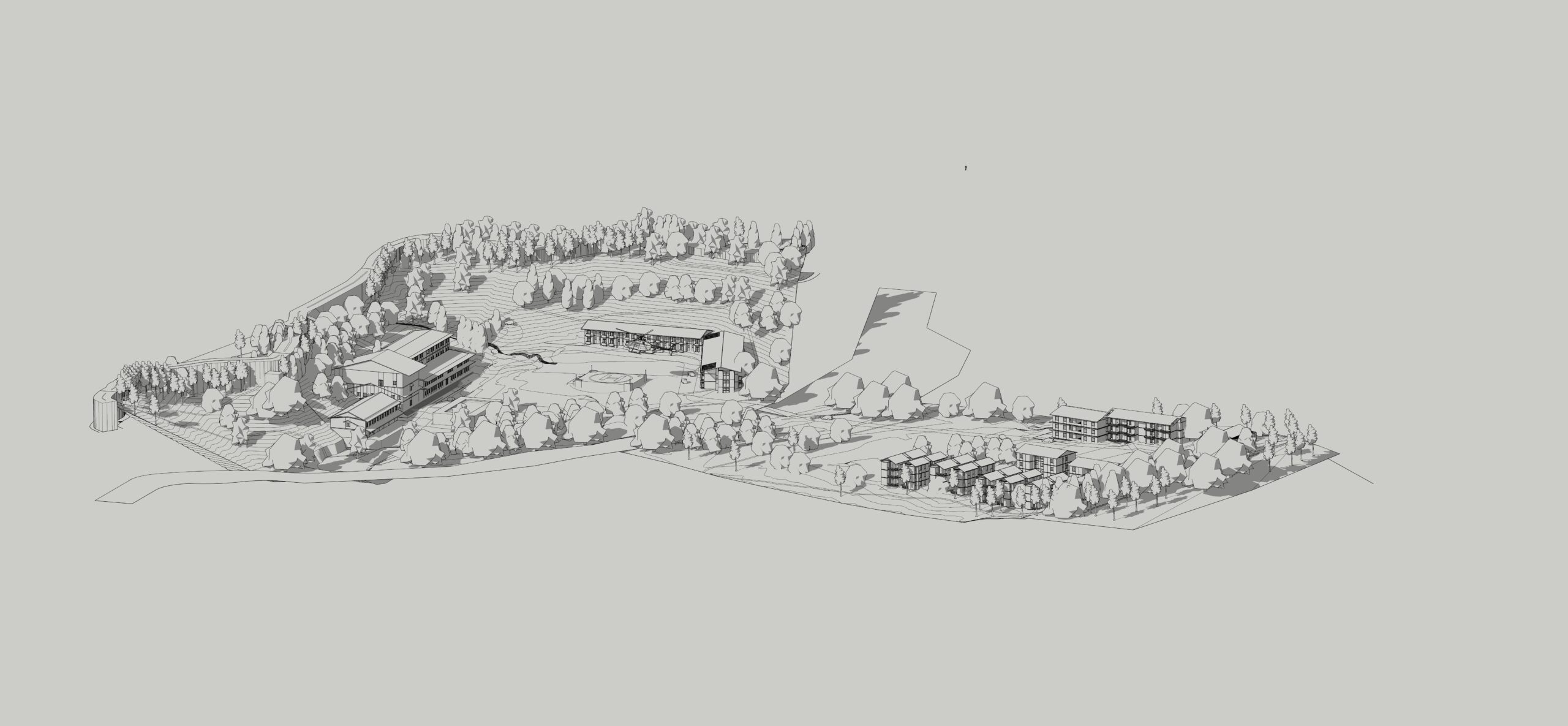 The proposed development of the Palampur Army Base Camp is envisioned as a climate-responsive, sustainable, and functionally efficient institutional campus, carefully integrated with the hilly terrain and ecological context of the region. The design responds to the client brief, climate, and site conditions by adopting a user-centric planning approach that prioritizes operational efficiency, environmental responsibility, and long-term performance. The campus master plan strategically organizes administrative blocks, auditorium, hospital, sports facilities, QM stores, garages, barracks, trainee hostels, and residential housing with clearly defined access from main and internal roads to ensure secure and seamless movement.