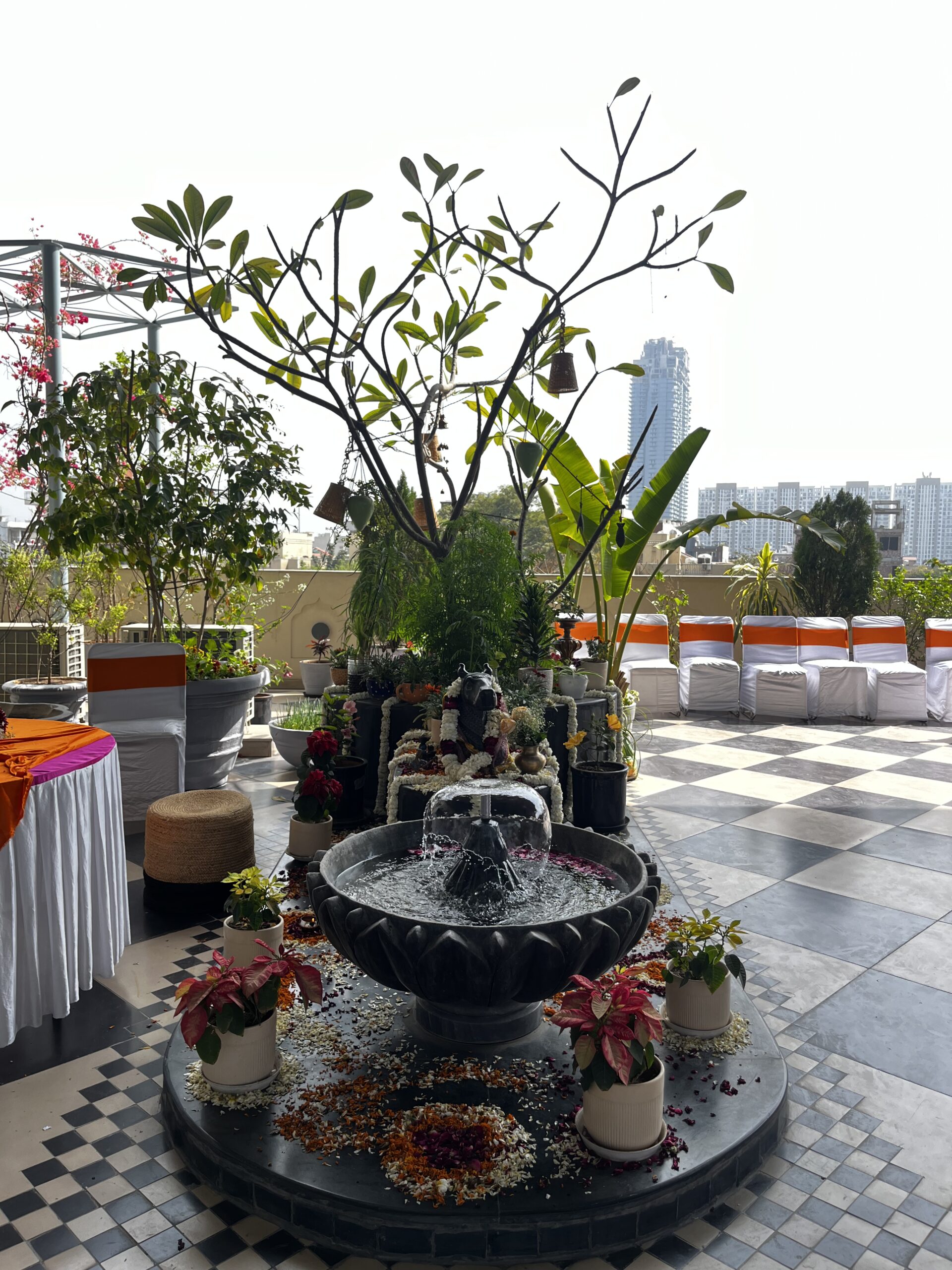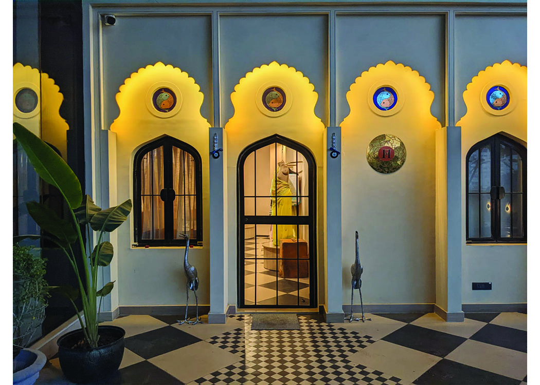 The moment we enter we see the Nandi and a fountain welcoming guests. There will a series of platforms on the right and huge wall with series of arches which actual is the focal point on the left side respectively. The five arches are main feature of space having an entrance glass door and two glass windows. The remaining one arch will have a traditional brass hammered brand logo which used to be there is Lucknow havelis and palaces and other one will have some mural art.