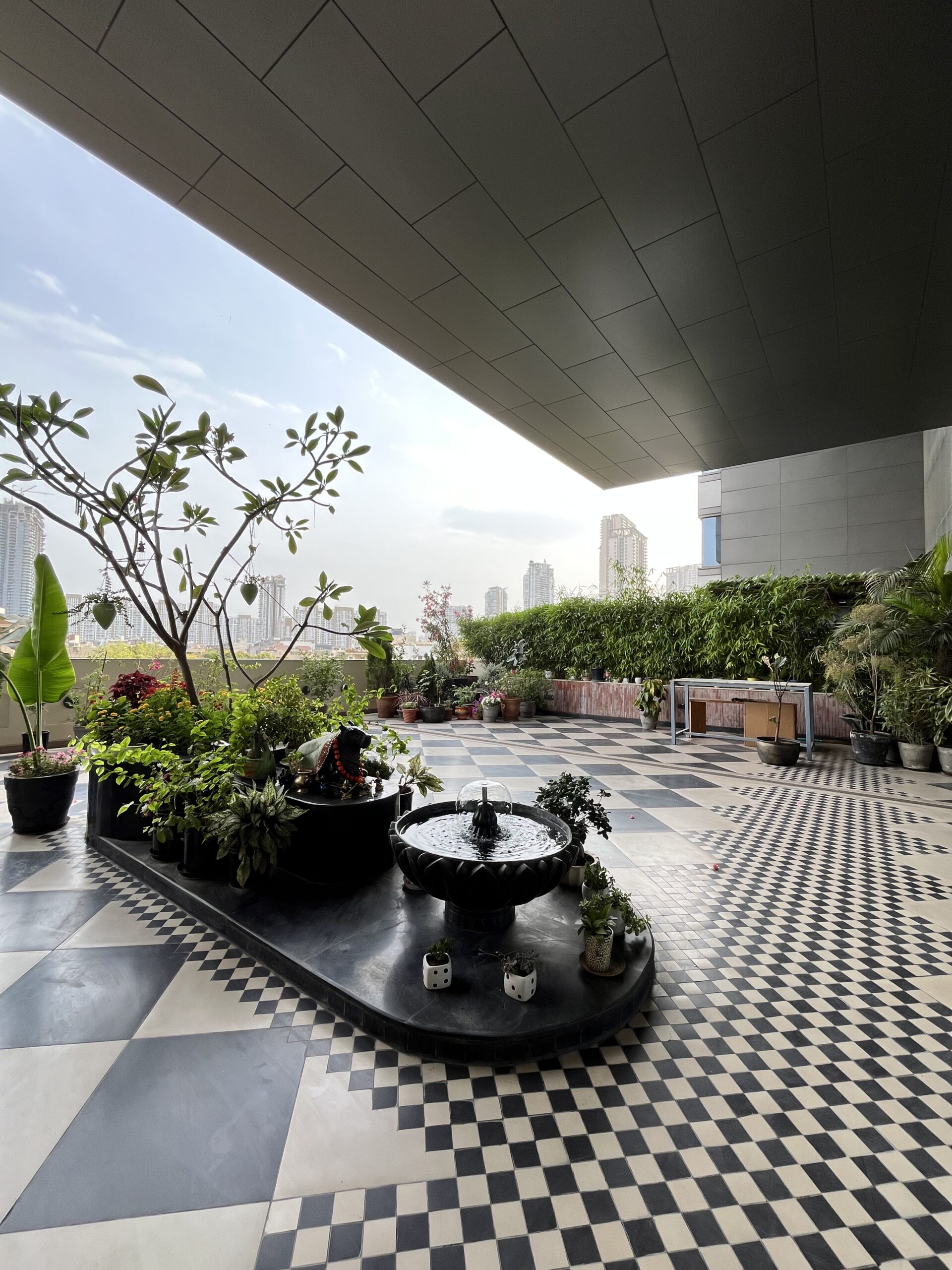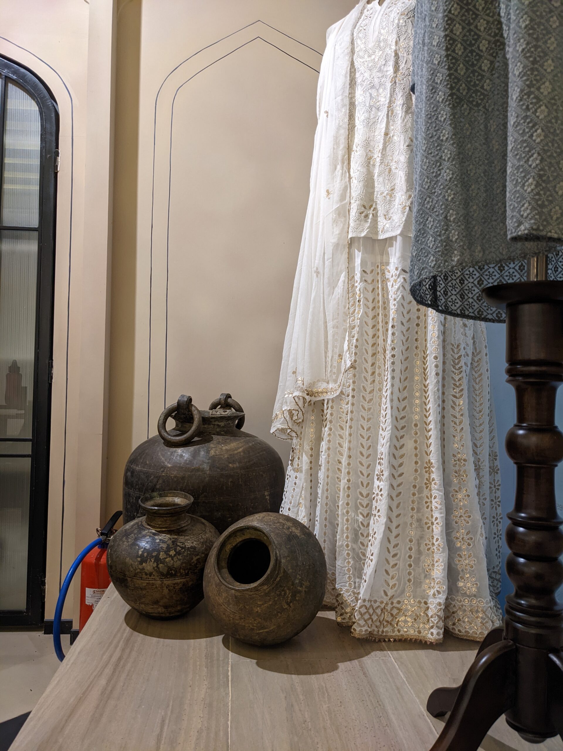 The two spaces copring the complete store. The internal part is primarily for display and discussion. the outside terrace is for hosting guests, events , shoots, promotions at certain times when the weather is suitable. The Opposite side of the arches is a partition all in customized bricks inspired from forms of Lucknow with a seating catering the huge horizontality of the views of the skyline of Gurugram.