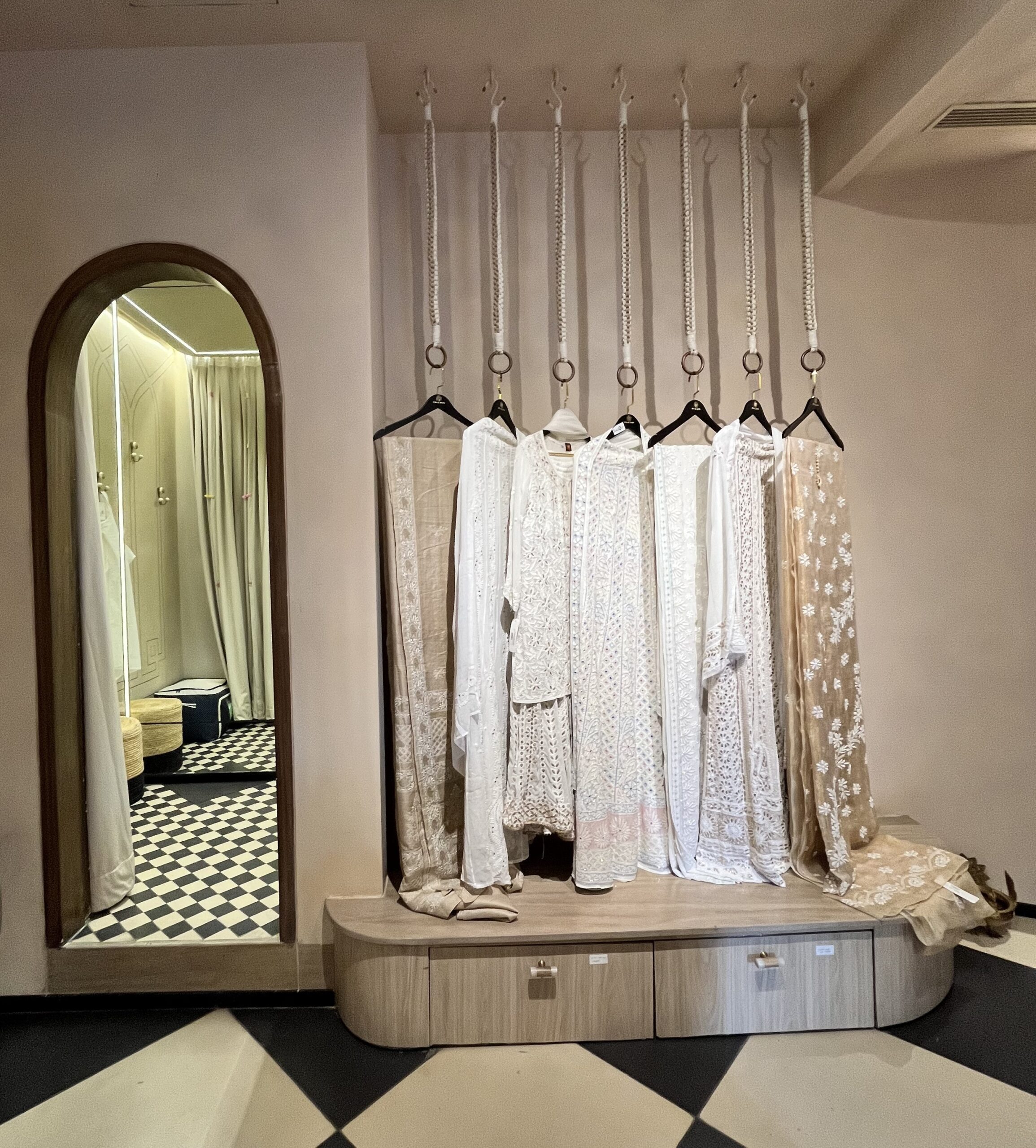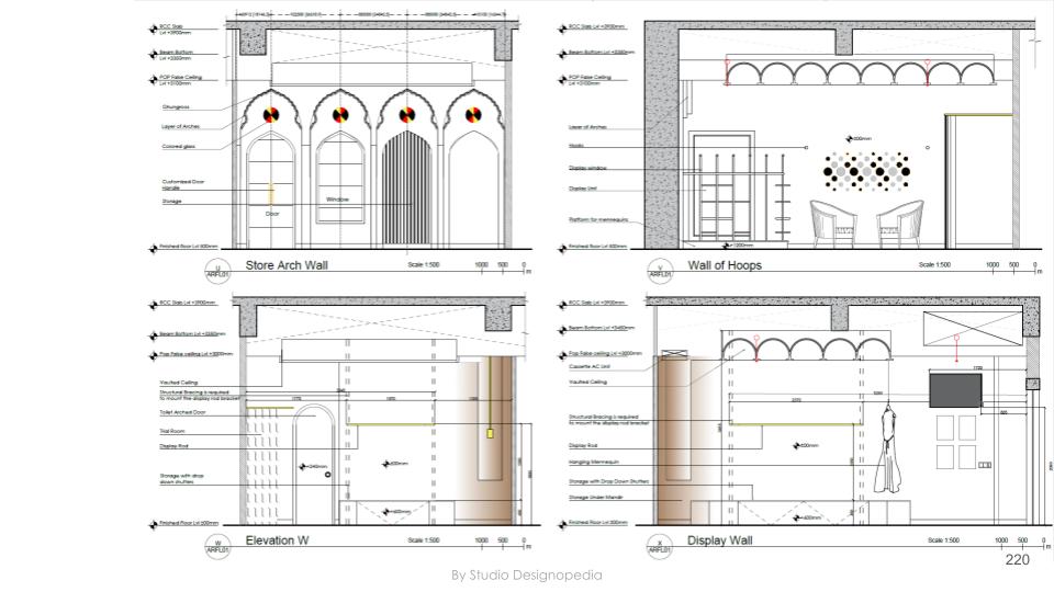 The entrance wall is an arch wall with series of layered arches from inside store with accents of ghungroos in it. To make the entire space monolithic and easy going all the forms are made avoiding right angle edges. The ceiling is in the form of vaults inspired by the structure used in past in havelis of Lucknow. .