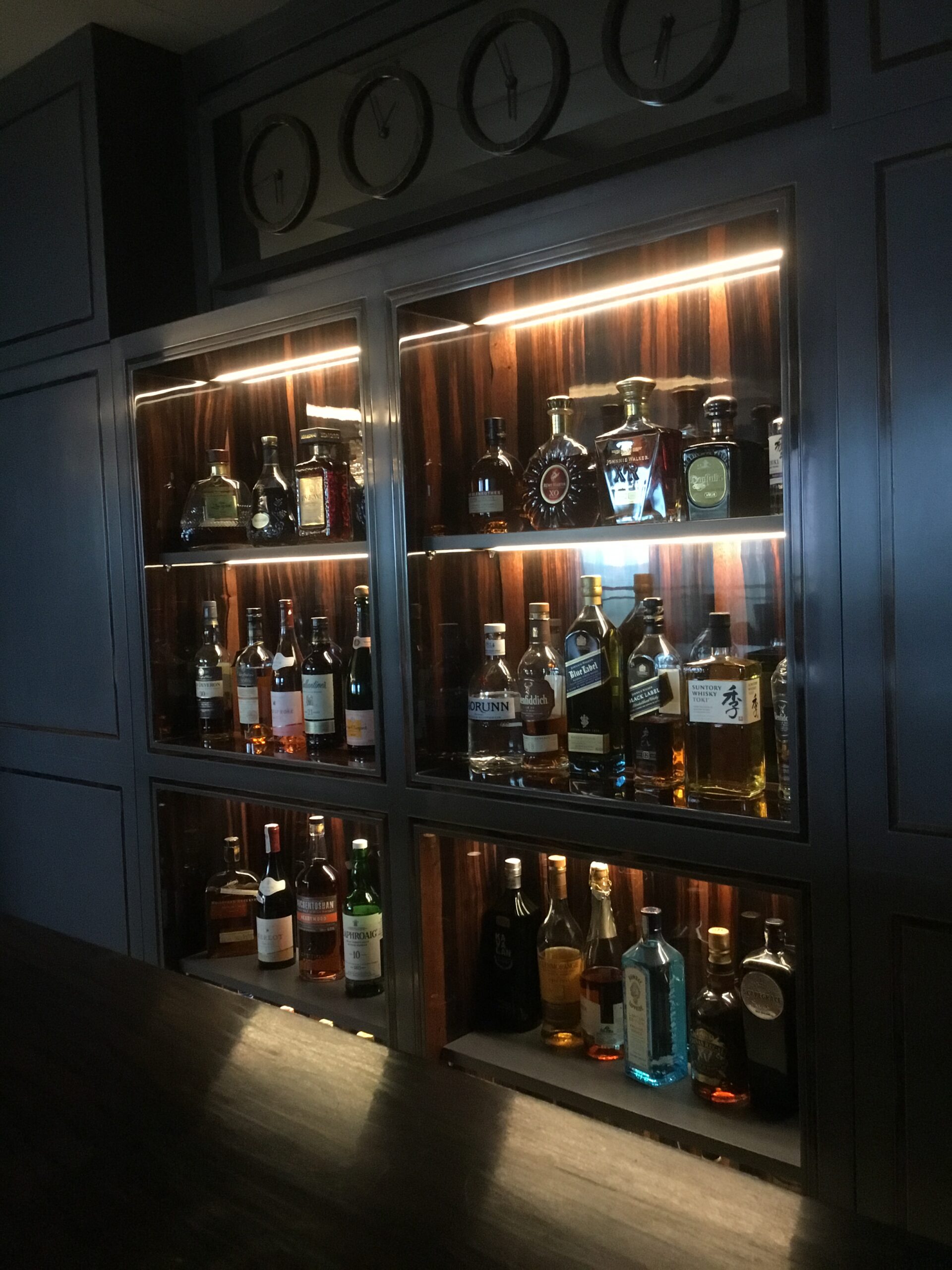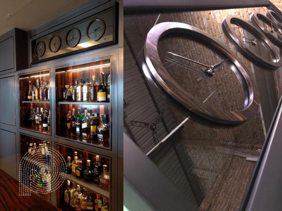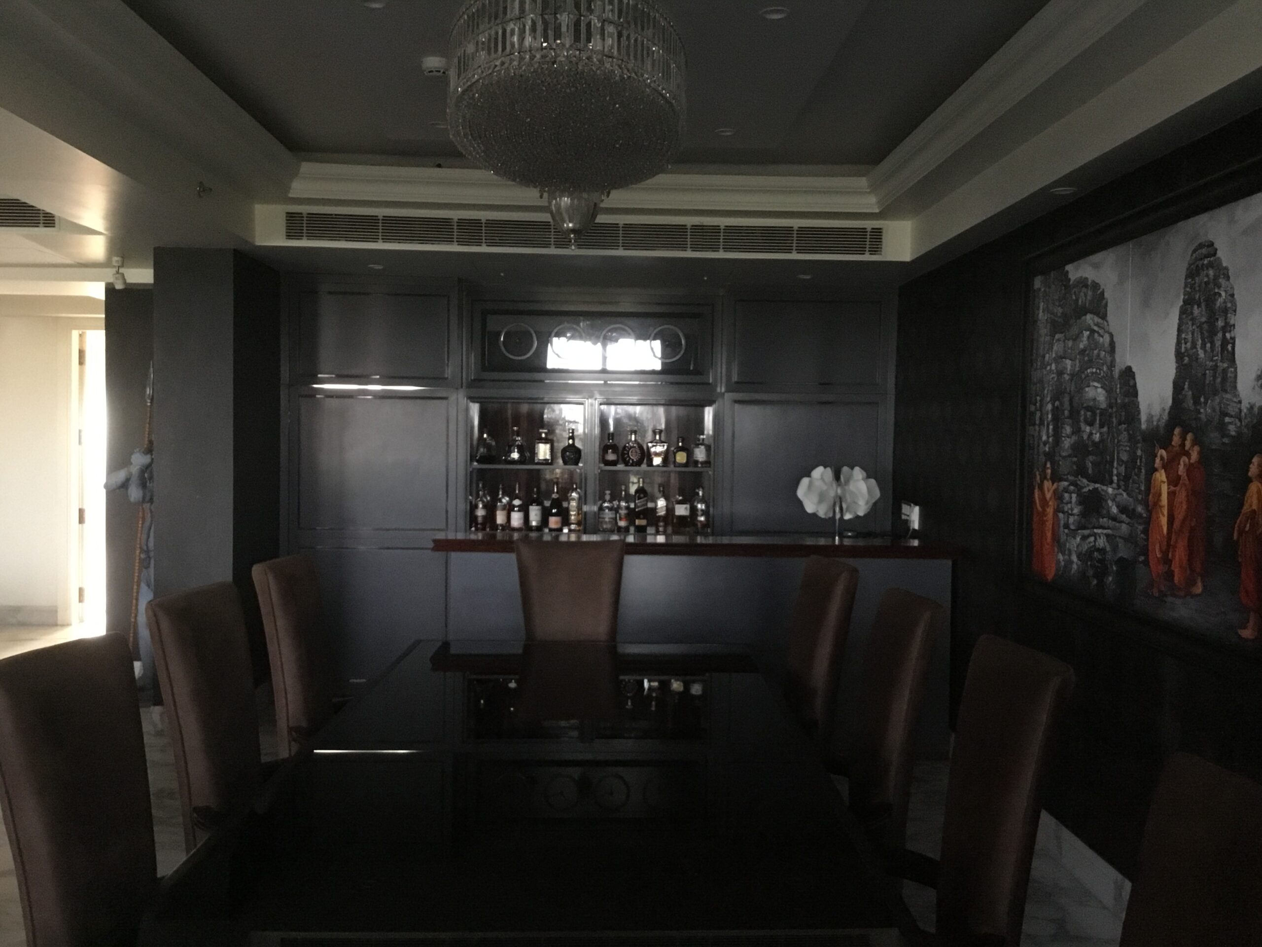 The Bar – The bar is planned with a sense of creating a dark corner with a timeless feel to it. The Huge dining table with three pendants on top has a very strong center line ending towards the symmetric luxury bar. The bar is a monolithic unit finishes in matt grey panels with a niche in center to keep bottles. The niche is finishes in high gloss ebony veneer as a highlight in contrast with the outer grey matt and has a light on top to highlight bottles. The left side of the bar is a service door leading towards pantry area and is hidden in paneling. Each panel of the bar unit has a ebony inlay strip running towards the periphery and is also finished with high gloss coat. The The major paneling pattern of wall is matte dark finish & with high gloss ebony wood inlay work in it that seems different in different lighting conditions. Since the high gloss inlay is reflecting and as a highlight at certain angles. The pocket on the top center has been created for the trapdoor and has a world clock made to the size of the panel. The minimalistic clock has black mirror with ebony rings on it. The bar counter top has been made with solid 65mm thick solid ebony wood in lacquer matte finish with a feel of open textile grains as a bar top.Sofa back unit in solid ebony wood is a 8 feet long unit with no intermediate supports and has been planned to develop a correlation between bar towards the seating area.