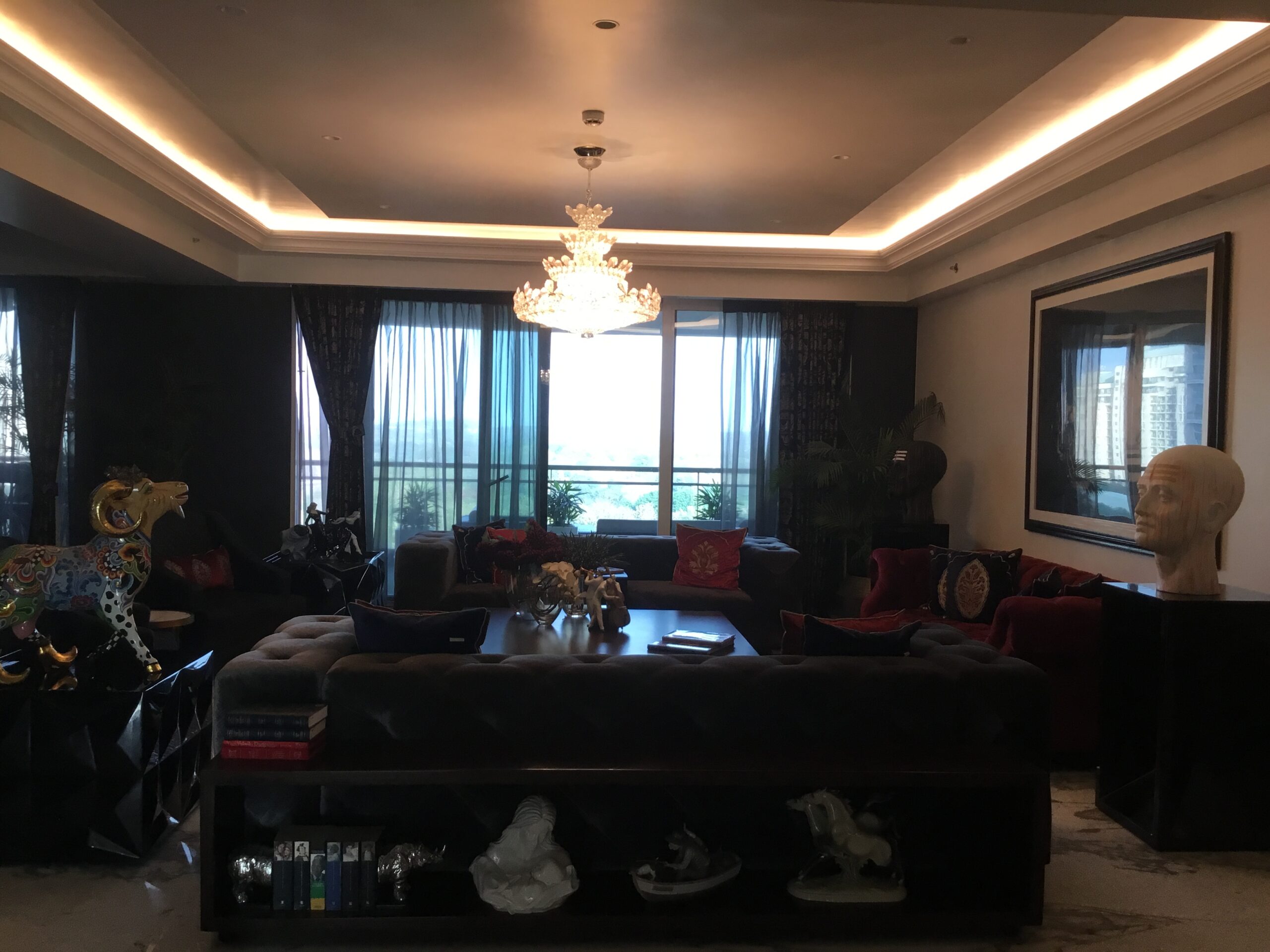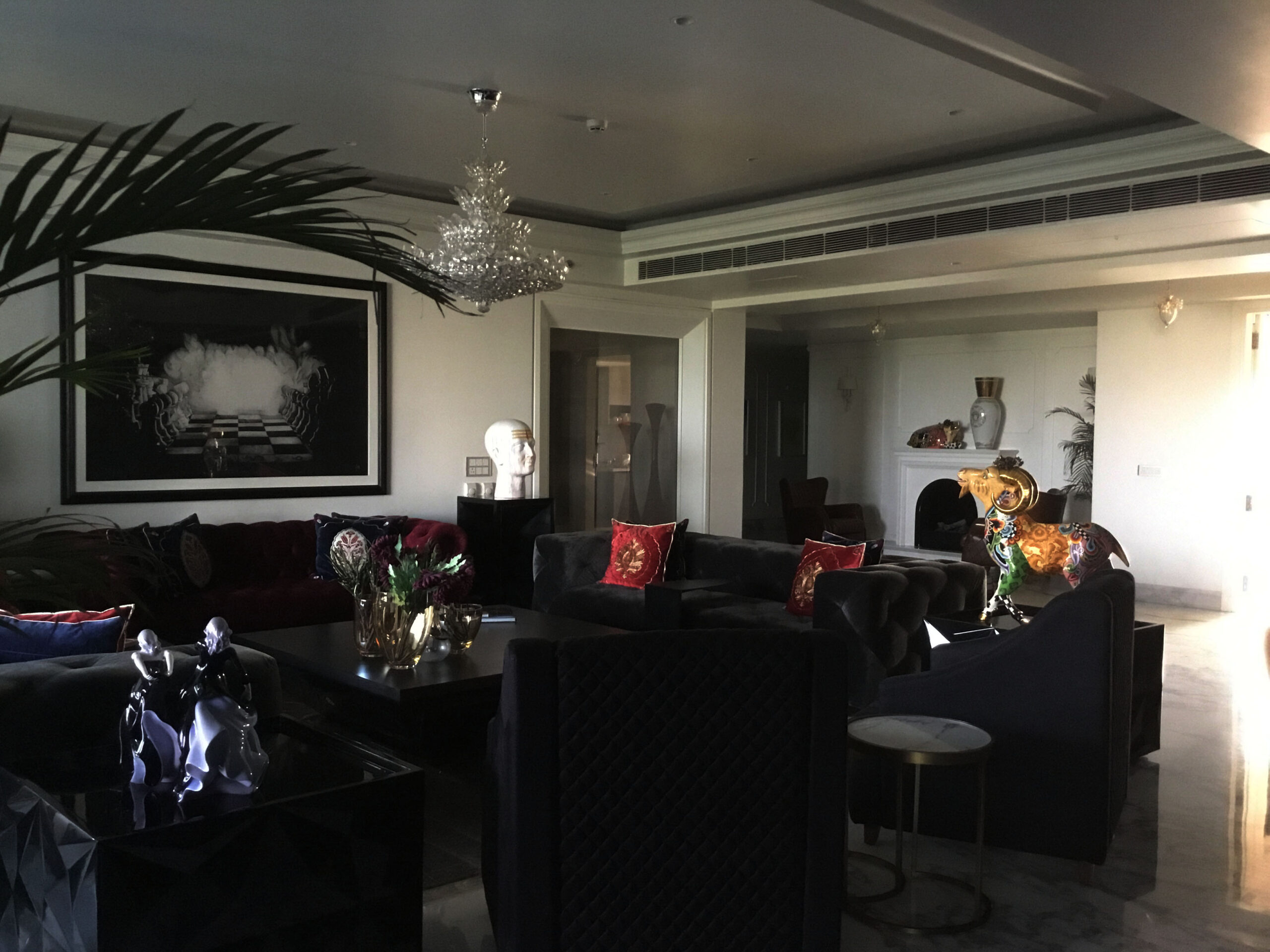 The Drawing Room is designed in such a way to have dark walls in contrast with all white entrance area in other corner. Only one wall is in white color adjacent to a huge windows to obtain maximum reflected natural light. A Kashmiri carpet has been chosen below center table for the seating cluster with subtle & dark tones acting as a binding element for the three existing sofas, a set of bespoke black check-patterned armchairs & elegant tall pedestal tables towards the wall. The existing center table has been coated in black metallic matte. The window wall has elite black versace curtains with golden motifs along with the antique brass planters containing tall areca palms.