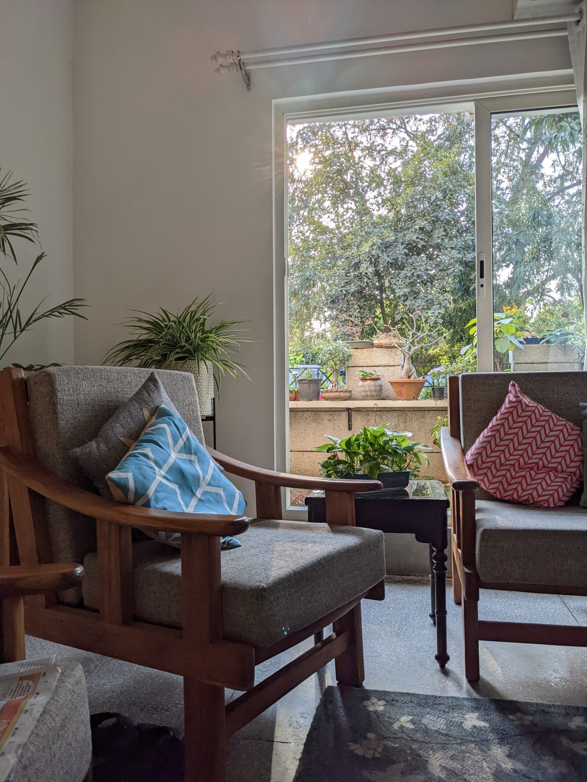 Since the project’s location was Greater Noida, we could imagine the couple sitting in an open lawn and soaking the winter sun; this also catered to the family’s requirement of accommodating the plants that they already owned.