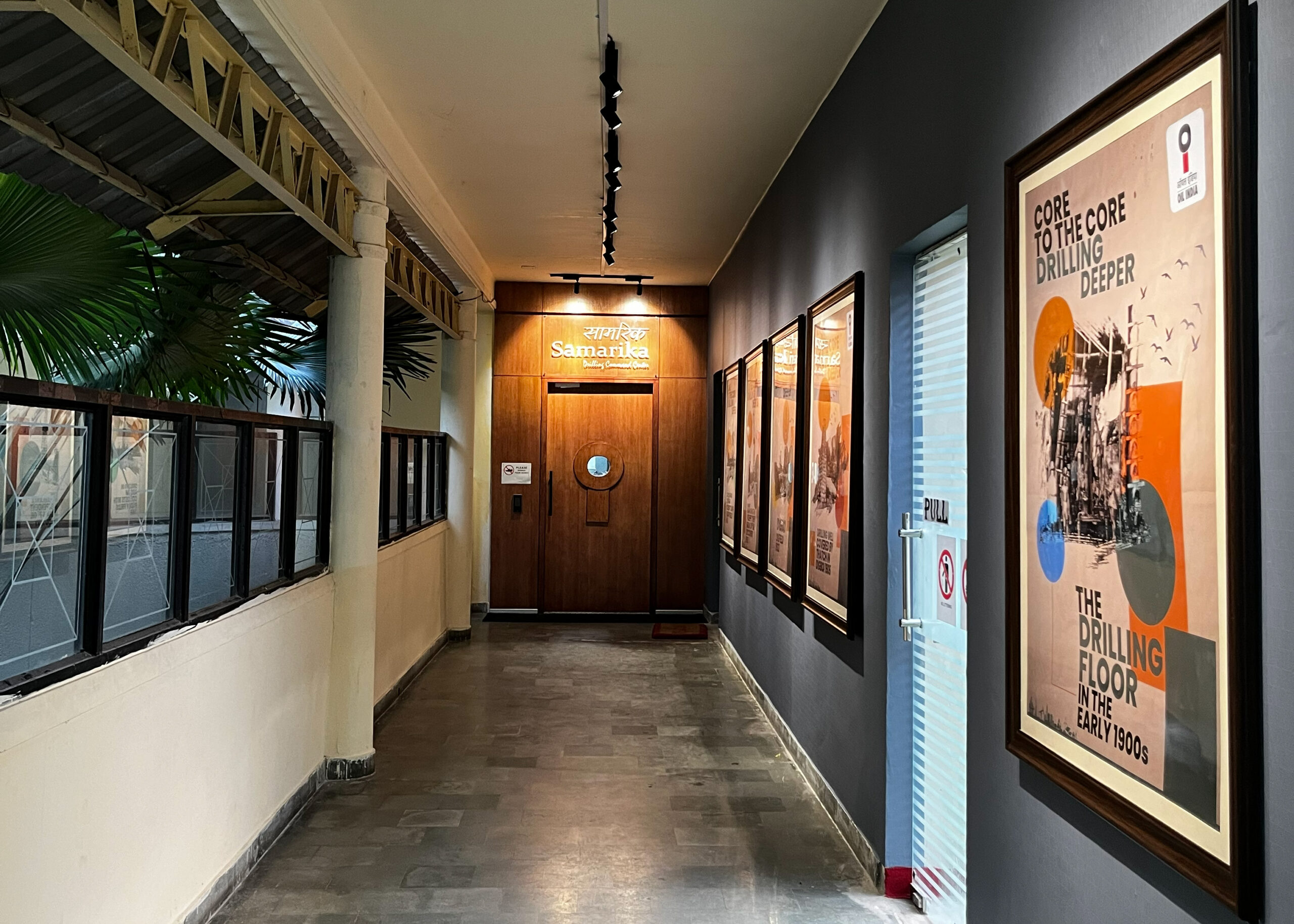 A recessed pocket near the video wall ensures that the display remains partially concealed from the entrance, revealing itself progressively as one moves deeper into the space. This intentional delay in visual access evokes the curiosity and anticipation inherent in oil exploration, where the quality and quantity of the resource remain unknown until the drilling process unfolds.