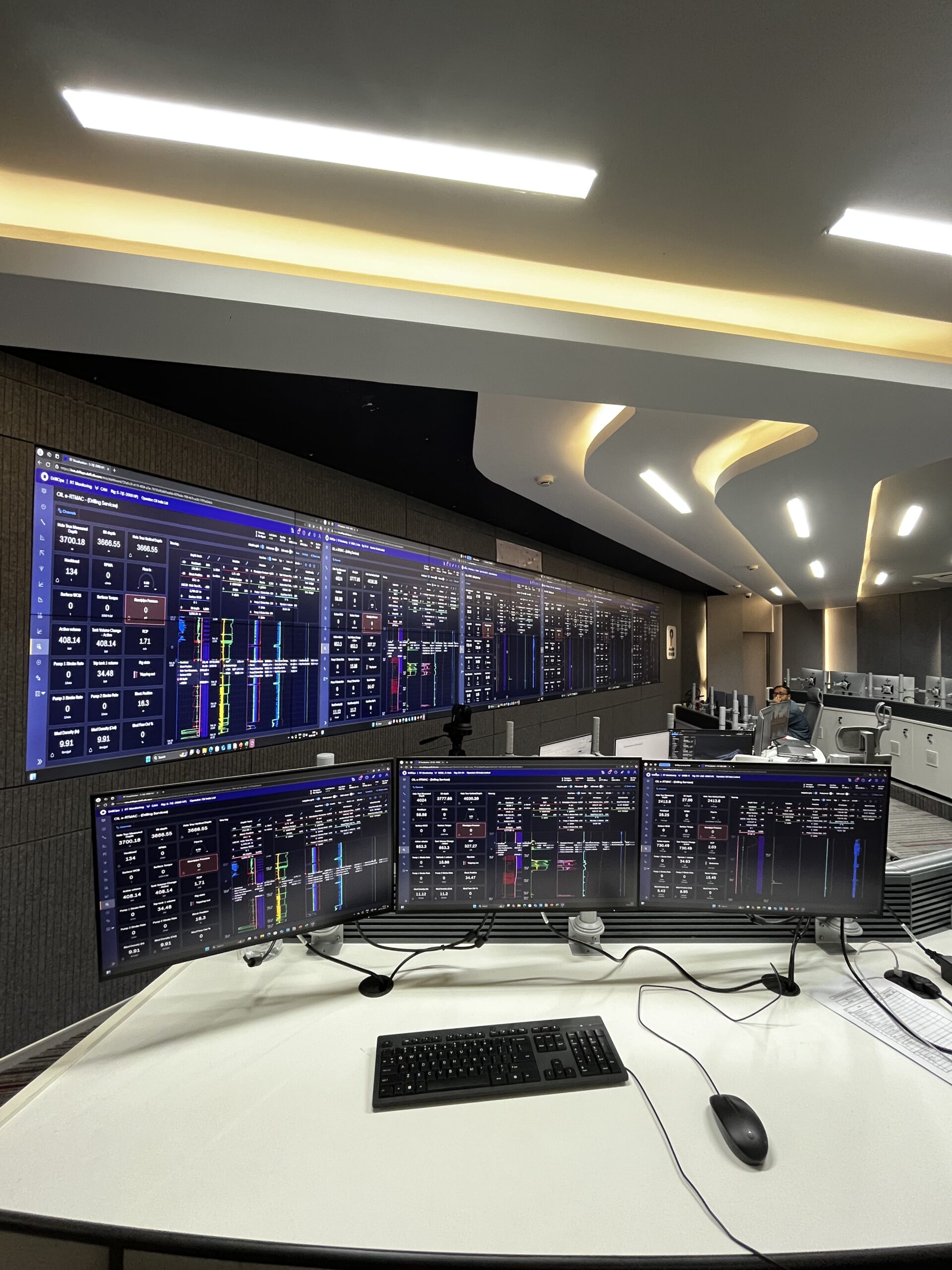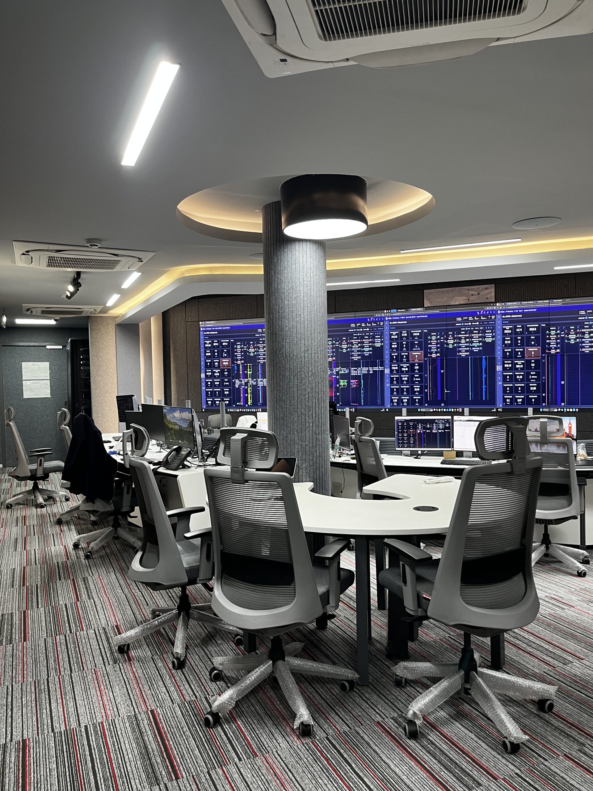 Concept Note: Interior Design Inspired by the Viscosity of Oil. The interior design of the command center draws inspiration from the physical properties of oil, particularly its viscosity and layered flow dynamics. The spatial composition mimics the gradual descent and stratification of oil, with architectural elements cascading inward from the raised ceiling toward the video wall. This design not only enhances visibility and focus on the wall but also creates a layered spatial experience.